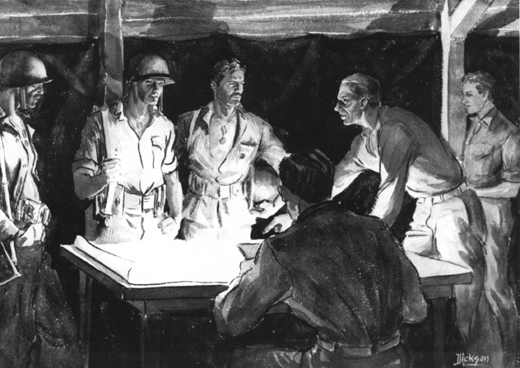 Of his watercolor painting "Instructions to a Patrol," Capt Donald L. Dickson said that three men have volunteered to locate a Japanese bivouac. The one in the center is a clean-cut corporal with the bearing of a high-school athlete. The man on the right is "rough and ready." To the one at left, it's just another job; he may do it heroically, but it's just another job.