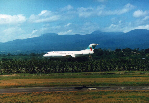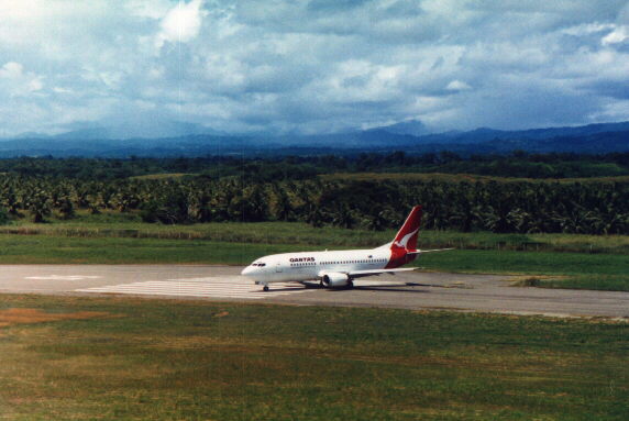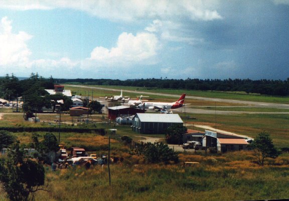 This is a photo of Henderson Airport taken in about May of 1996. This was taken from on top of the WW2 control tower which is still standing and is looking toward the east and Red Beach. Tenaru is several miles away on the right hand side of the picture. You will notice there are a variety of aircraft on the tarmac. The QANTAS 737 is on a scheduled run servicing Fiji/Vanuatu/Honiara/Brisbane. The Air Niugini (Papua New Guinea) F28 is on a scheduled run between Port Moresby and Honiara. The Lockheed Electra was used for a time to carry fresh tuna for the Japanese sushimi market from Honiara to Cairns or Brisbane in Australia, where the fish is then transferred to a Japan Airlines 747 for transport to Japan. The fish is generally on the auction floor in Tokyo within 12 hours of leaving Honiara!! You will also notice a Russian Kamov helicopter in the photo which is one of several in the Solomons that are used to support the logging industry.